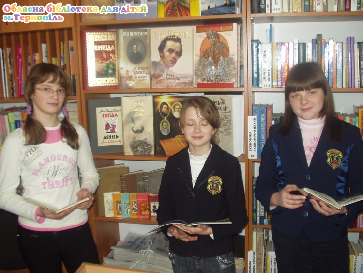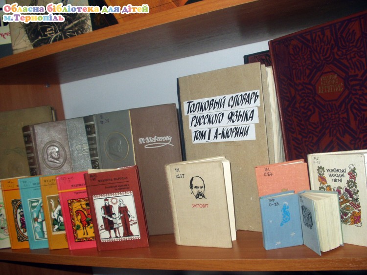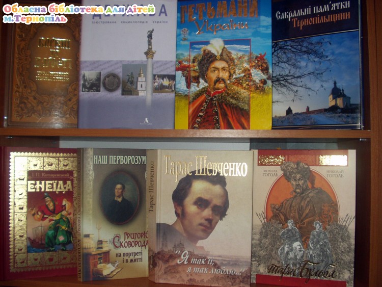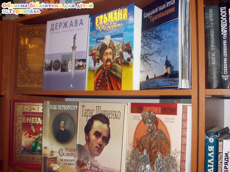 В обласній бібліотеці для дітей на відділі 5 -11 класів оформлено книжково-ілюстративну виставку „Скарби нашої бібліотеки”, на якій представлено такі книги: ілюстрована енциклопедія України „Держава”, „Гетьмани України”, „Сакральні пам’ятки Тернопільщини”, видання Котляревського „Енеїда” українською і англійською мовами, раритетні видання творів Т.Г.Шевченка (1949), О.С.Пушкіна (1941) „Толковый словарь русского языка” (1935), міні-книги: „Заповіт” Т.Г.Шевченка, українські народні пісні та книги з серії „Мудрість народна” та інші видання.