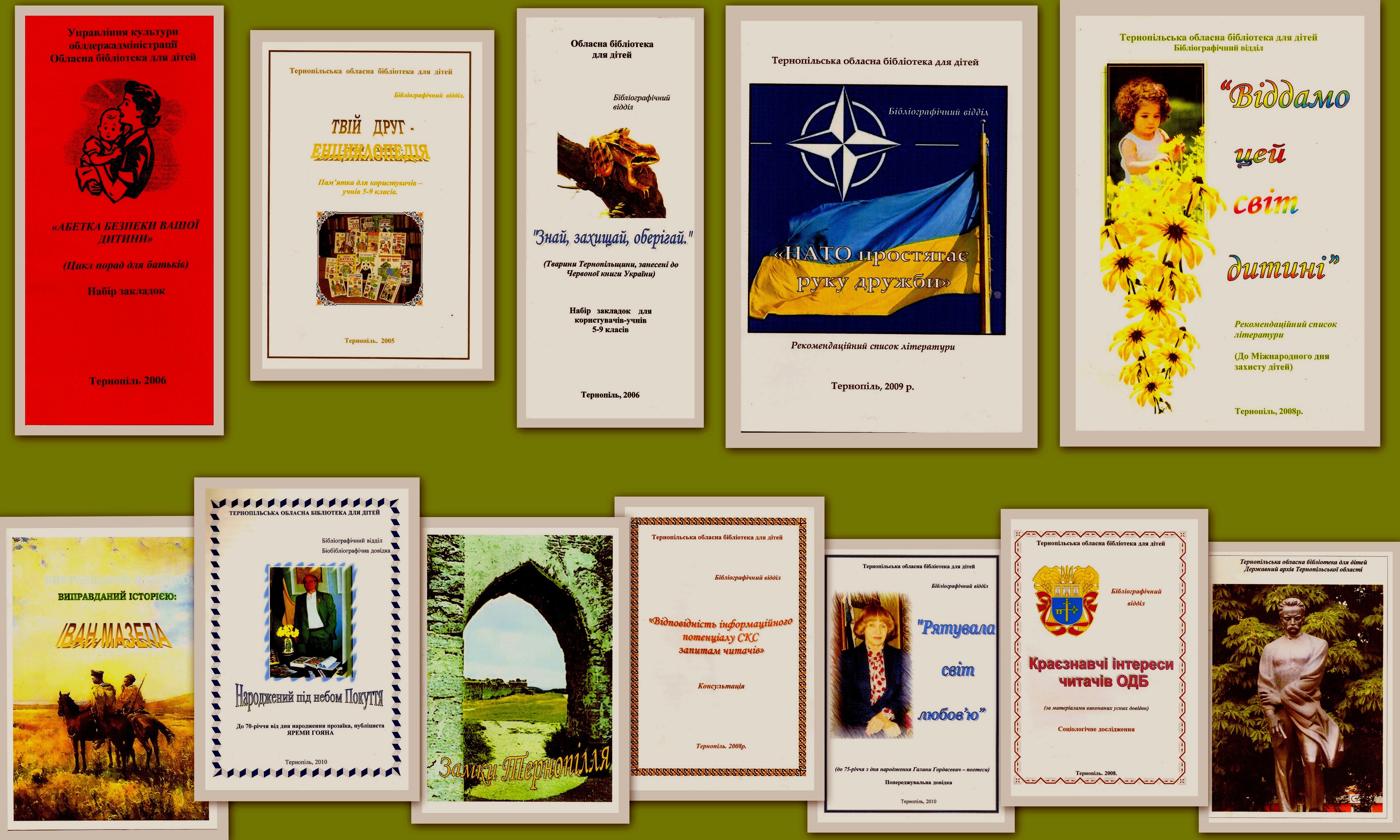 При підготовці матеріалів працівники відділу звертаються до фондів інших бібліотек області – науковий, молодіжний, а також художнього та краєзнавчого музеїв. Видання відділу актуальні і багатогранні – це і набори закладок „Абетка безпеки вашої дитини”, „Зелений дивосвіт”, „Знай, захищай, оберігай”, і пам’ятка для користувачів учнів 5–9 класів „Твій друг – енциклопедія”, і рекомендаційні списки літератури „НАТО простягає руку дружби”, „Віддамо цей світ дитині” (До Міжнародного дня захисту дітей), і бібліографічна довідка „Іван Мазепа: виправданий історією” (До 370-річчя від дня народження гетьмана) та інші.