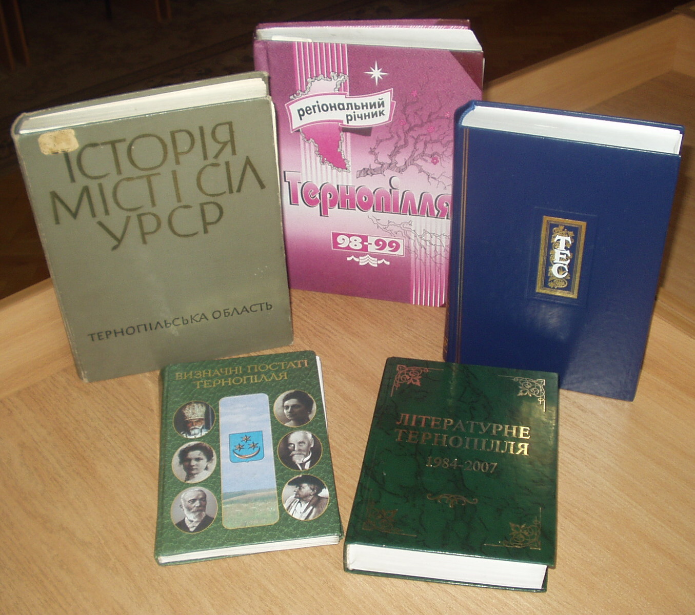 -«Визначні постаті Тернопілля», а також книги письменників Тернопільщини: Л.Крупи, Б.Лепкого, М.Самчука, Ю.Опільського, Б.Мельничука та інші.